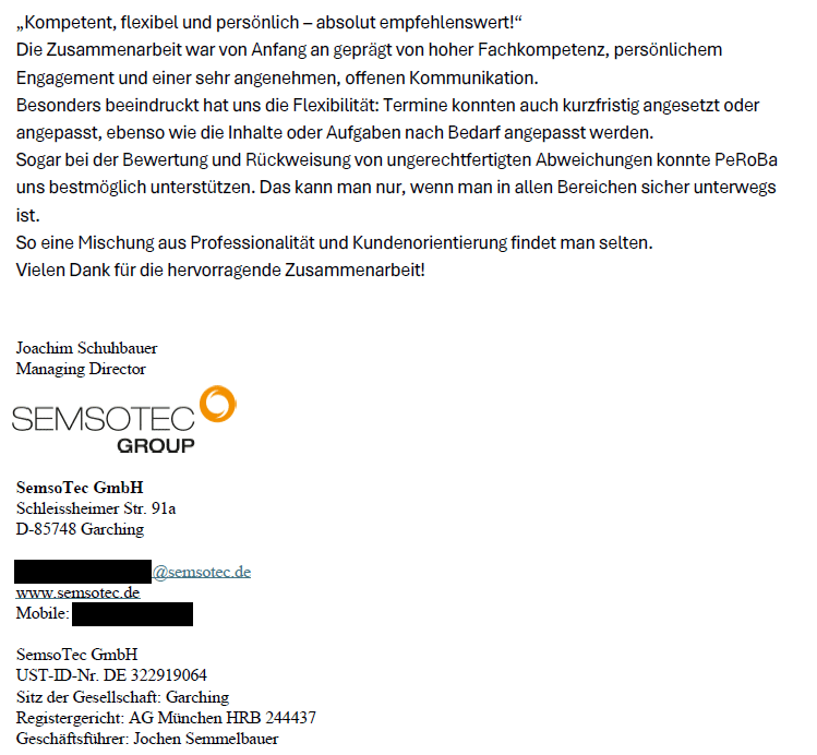Die Firma SemsoTec GmbH hat die PeRoBa GmbH als Berater zur Verbesserung des QMS beauftragt. Im Rahmen der Beratung wurde weitere Unterstützung in Übernahme der Rolle eines externen QMB gewünscht. Anfang September erhielten wir vom Geschäftsführer der SemsoTec folgende eMail: